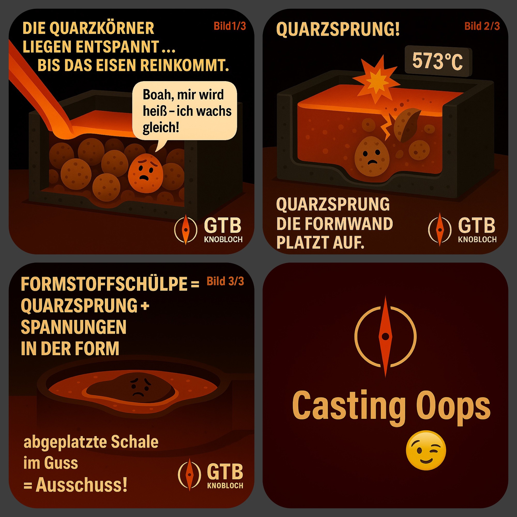 Kurze technische Skizzen aus 34 Jahren Gießereipraxis – typische Fehlerbilder, Phänomene und kleine „Oops-Momente“.
